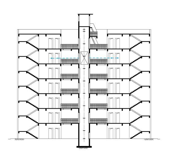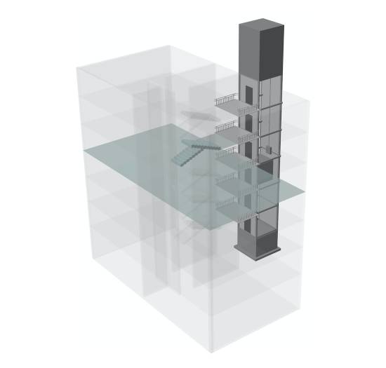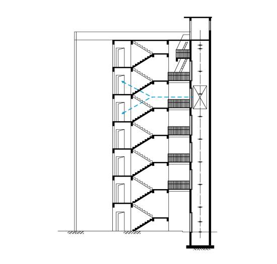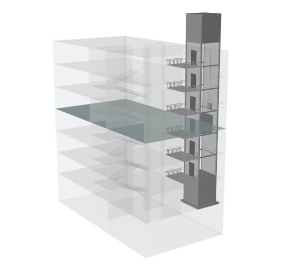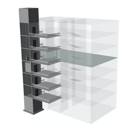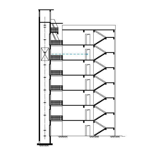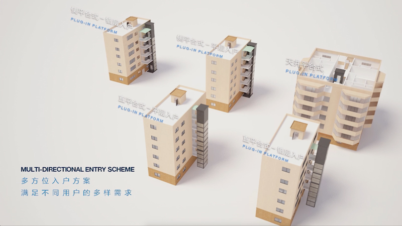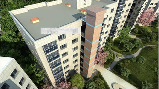 平層入戶是指電梯出入口位于樓梯平面,實現乘坐電梯直達指定樓層。直平臺式(平層入戶)可從住宅樓正面實現入戶,要求建筑物的正面空間足夠寬廣,加裝電梯后進出樓梯的距離滿足相關安全走火通道等要求。